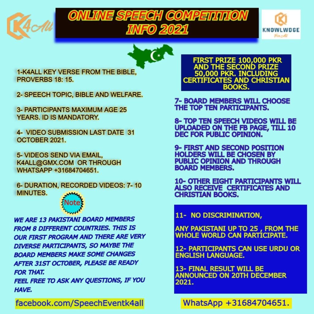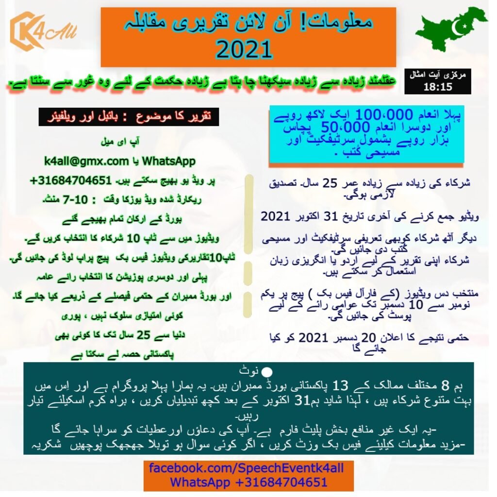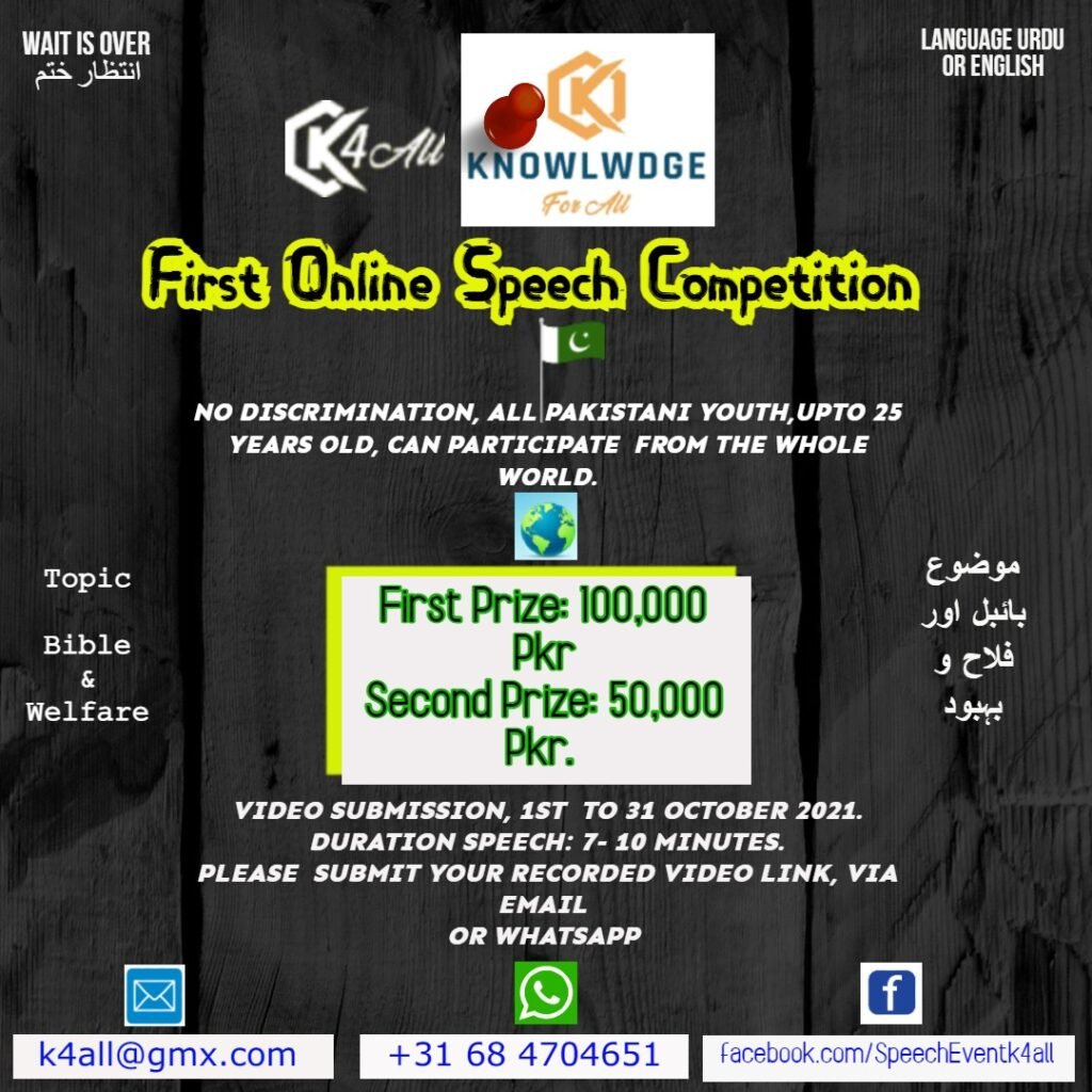 First Prize 100,000 PKR and the 2nd Prize 50,000 PKR. Including Certificate and Christian Books